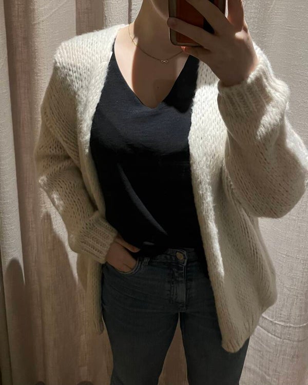 Een vrij dunne en zachte stof (kriebeld niet). Goed te combineren met onze andere items. (Voor zekerheid een hemd eronder aan doen)